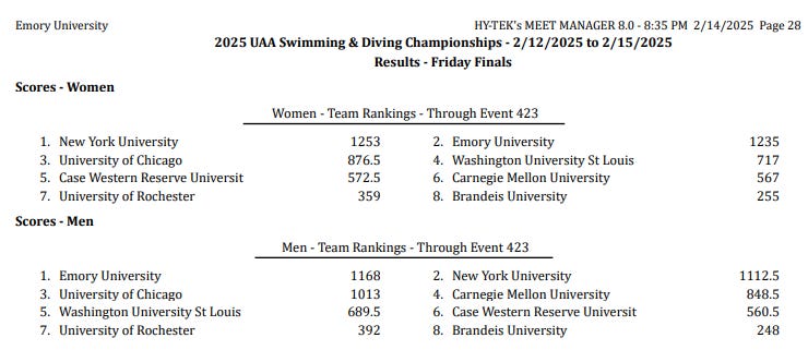 On the women’s side, NYU is marginally ahead of Emory heading into the final day. Three days ago, a former NYU swimmer’s dad asked us if we thought the NYU-Emory battle would come down to the last relay. At the time, we thought that was unlikely. But now… maybe, Ed. Just maybe.